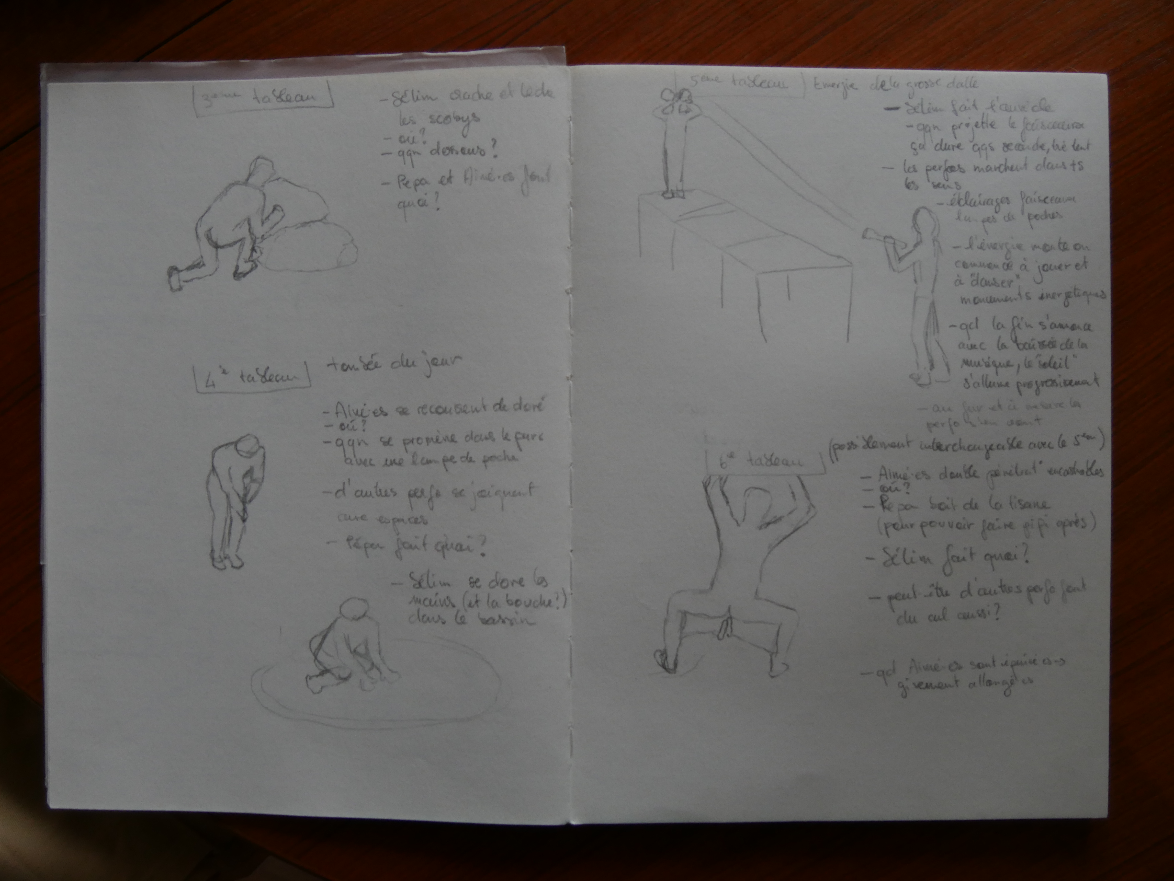The workshop participants were asked to send beforehand, a detailed description of one of their performances, that may be performed during the workshop: a purely technical description of the subsequent activities performed during the performance, along with specifications of the time-code. Those performances description served as the starting point for the workshop.